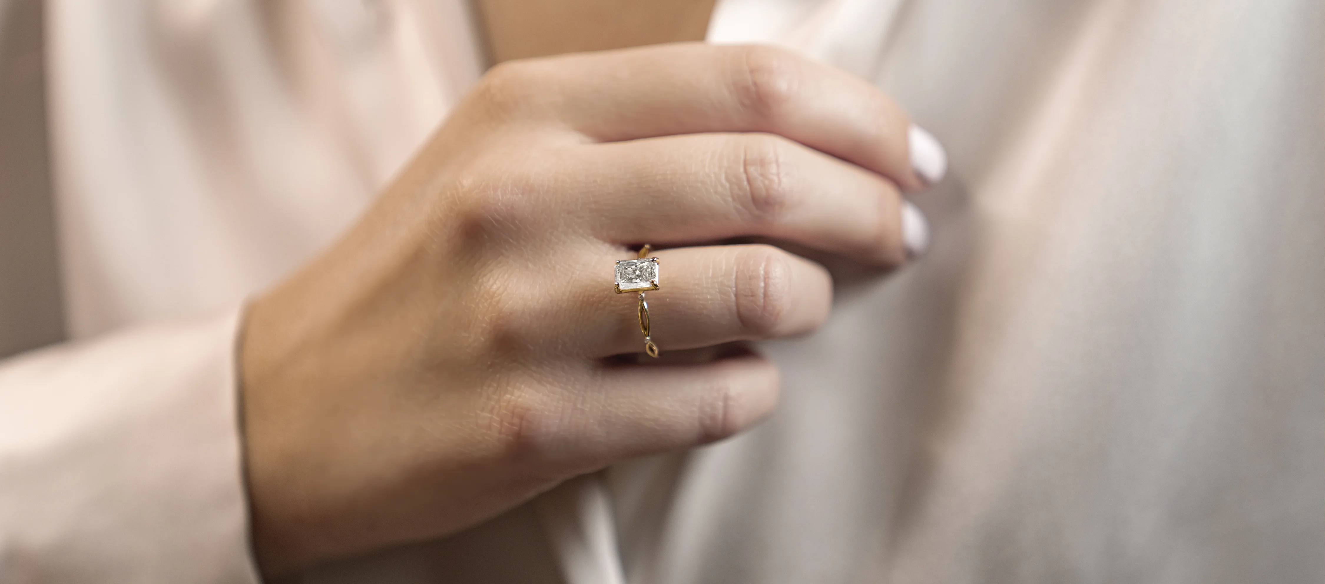 Diamante central lab-grown talla Radiante. Color D, claridad VVS1 y corte excelente.