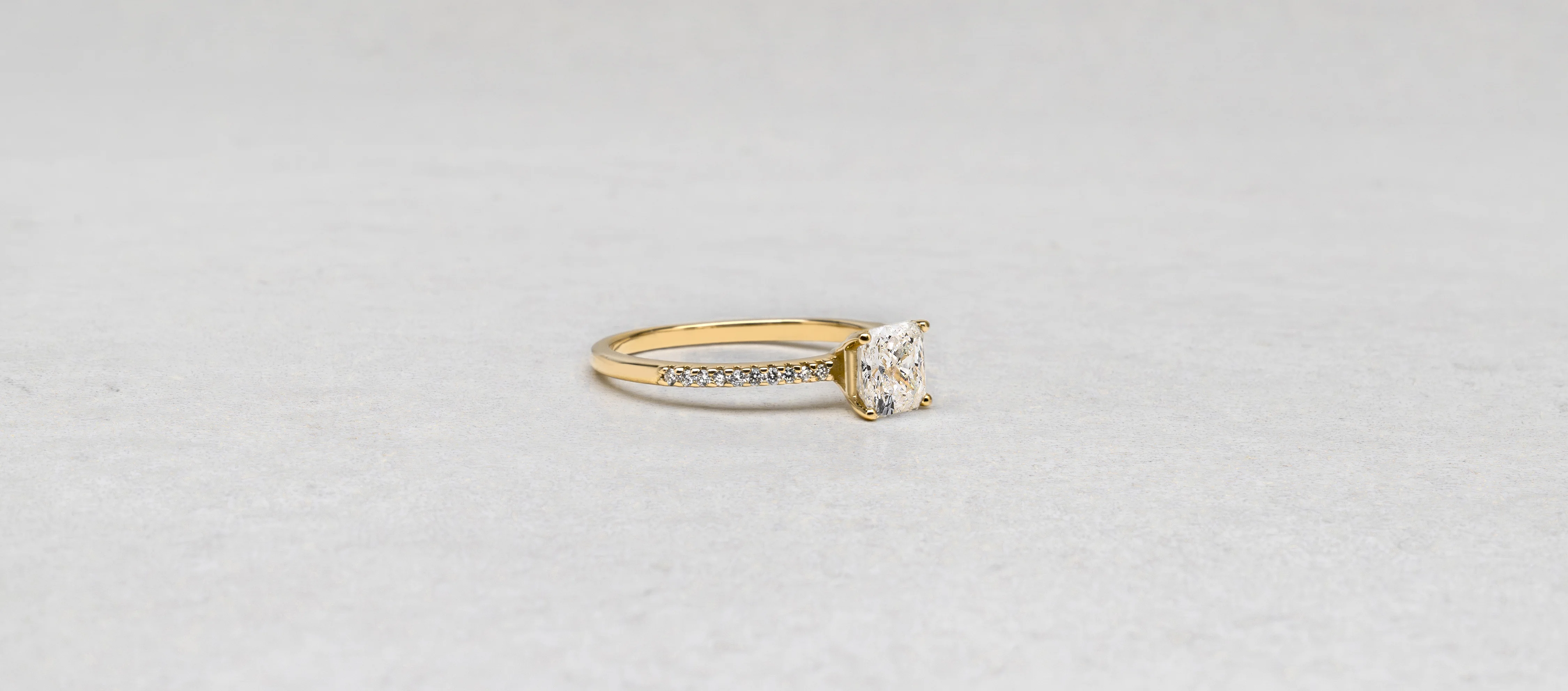 Diamante central lab-grown talla Cushion. Color D, claridad VVS1 y corte excelente.